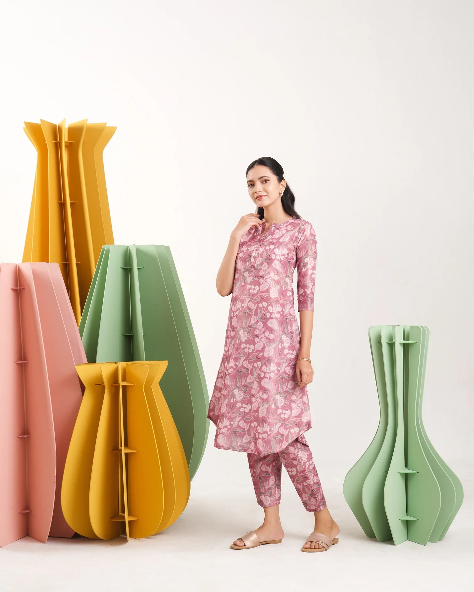 - This set features a light pink kurta with an all-over floral print, matching pants, and functional pockets for added convenience.