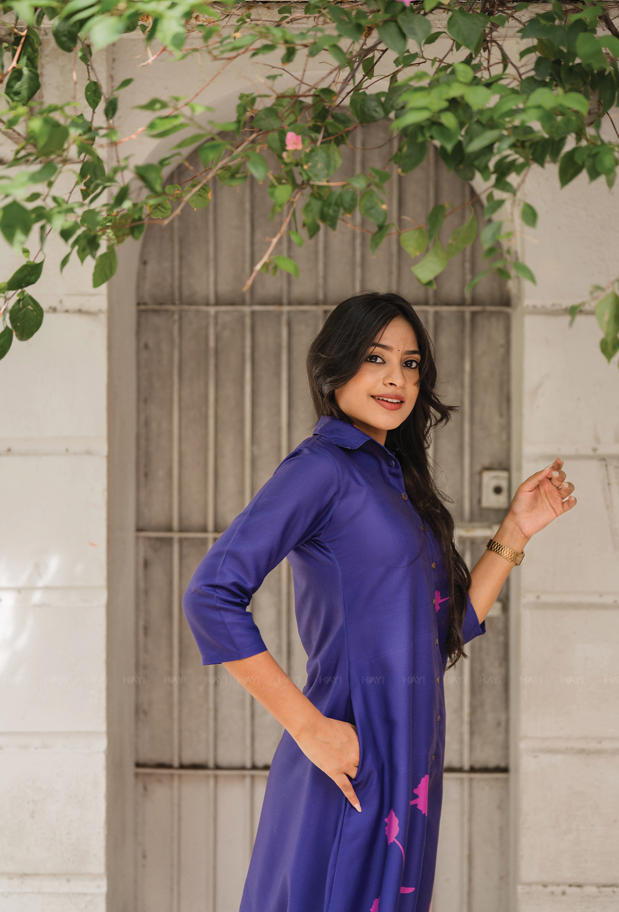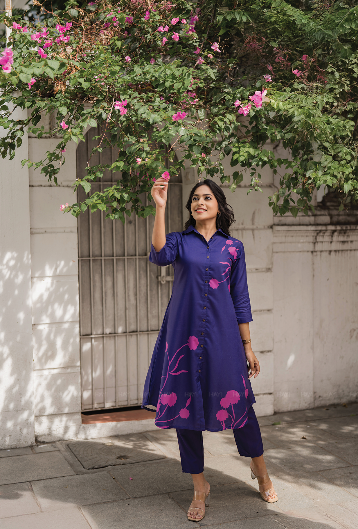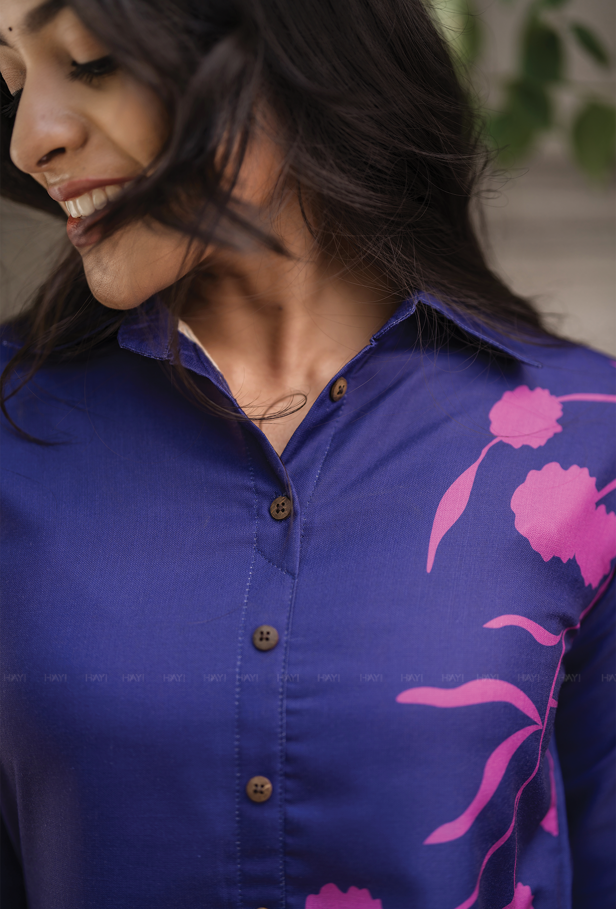 Turn heads in this contemporary indigo Co ords set, featuring bold floral prints and a flattering A-line silhouette — perfect for workdays or weekend outings.