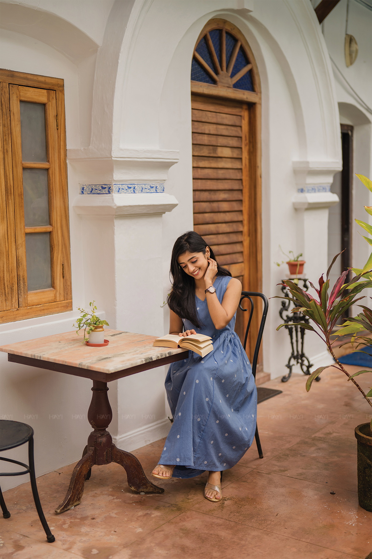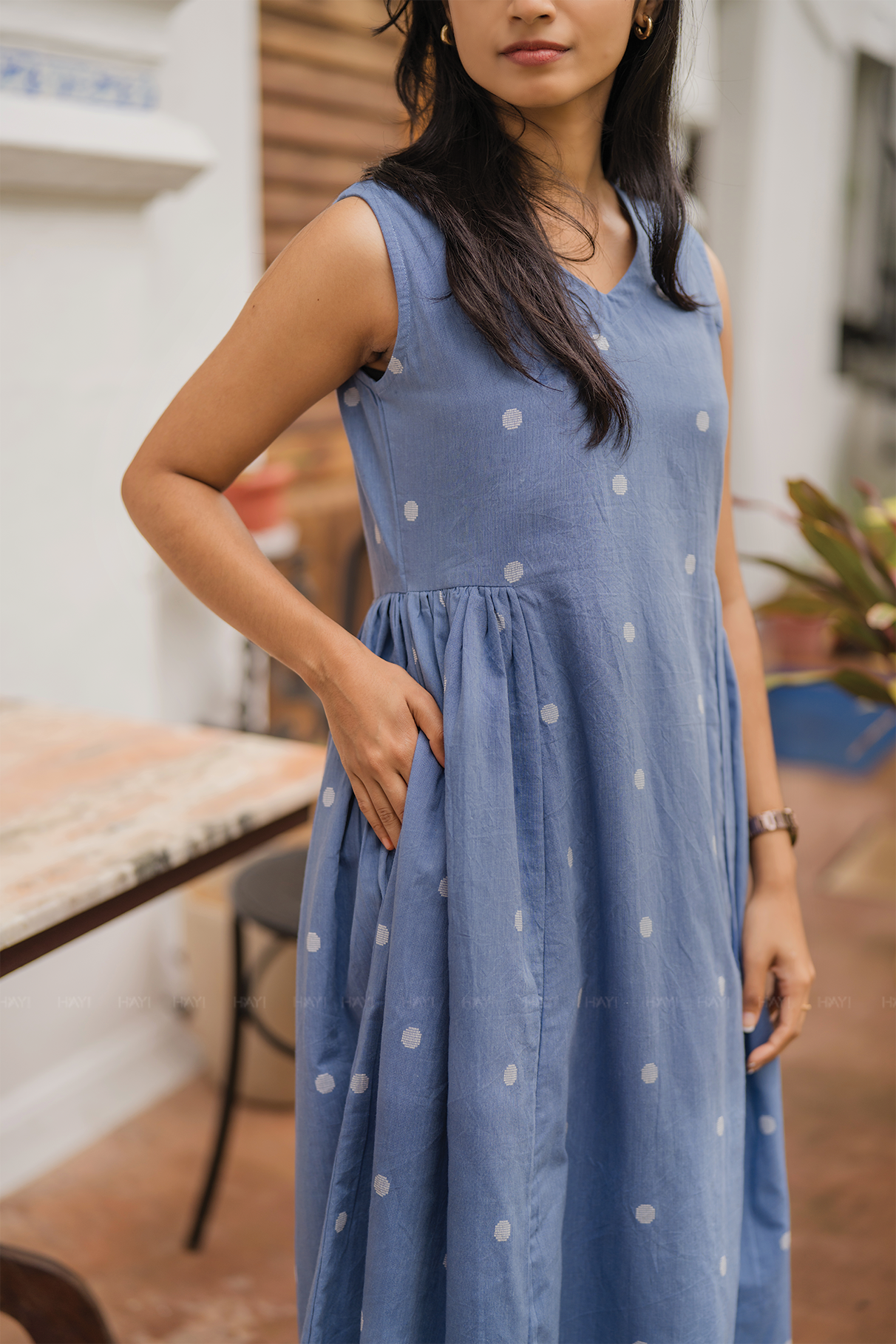 Step into timeless charm with the Ocean Polka Dress, a breezy blue piece adorned with playful white polka dots. Crafted from handloom cotton, this dress combines breathable comfort with everyday elegance. Its A-line silhouette flows gracefully, making it a versatile choice for both casual outings and festive gatherings.