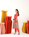 - The set features a coral pink kurta with a bold floral print, matching pants, and a floral-printed dupatta with scalloped edges.