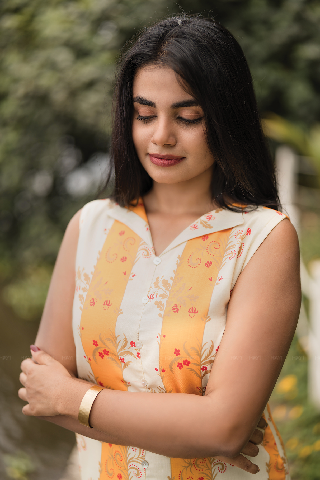 Add a pop of sunshine to your wardrobe with this yellow striped casual dress.This style is both fresh and versatile. It comes with ¾ detachable sleeves inside, giving you the freedom to switch between sleeveless and covered-up looks as per the occasion.